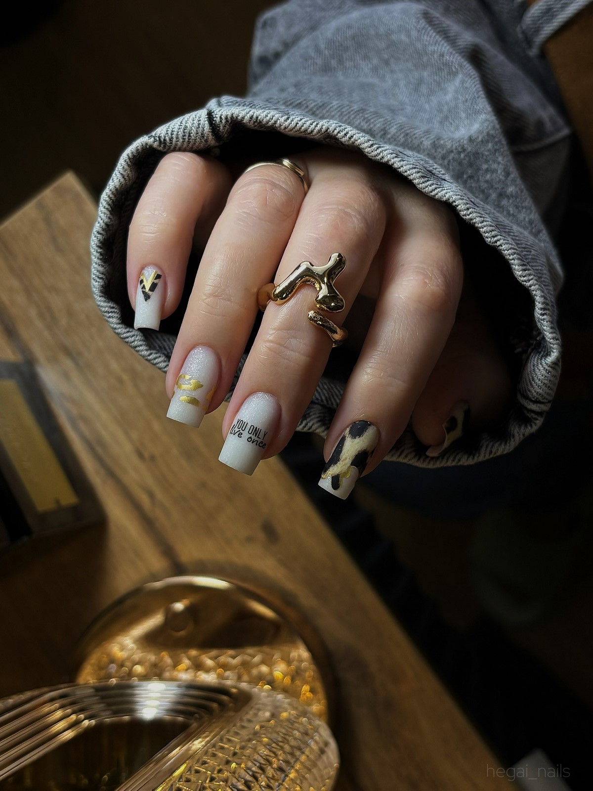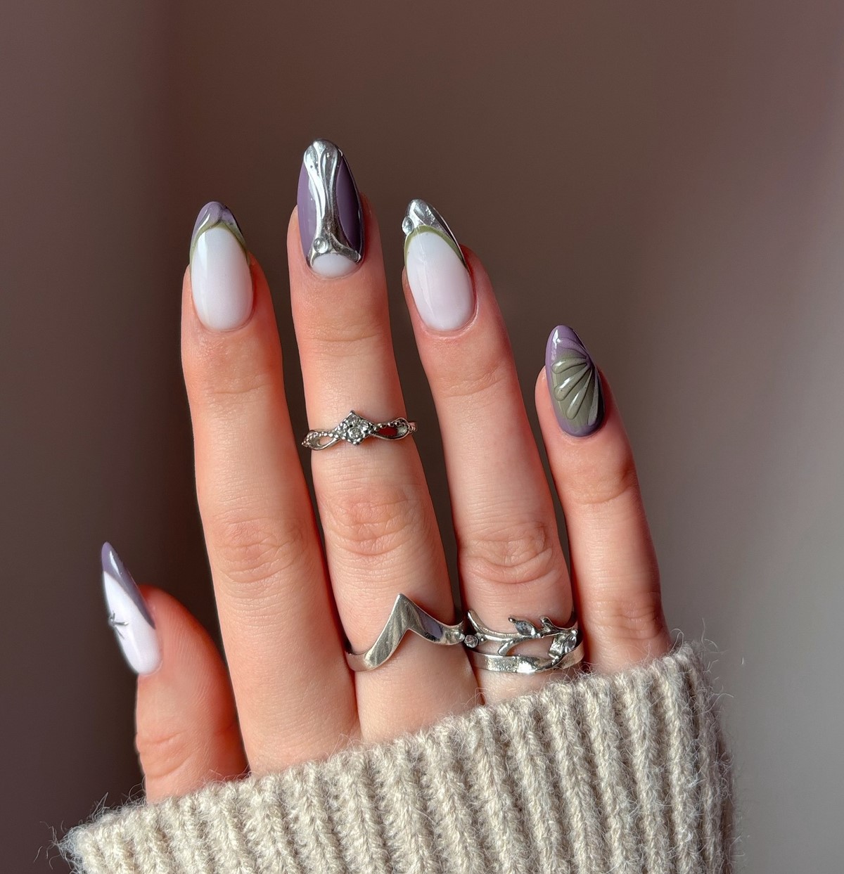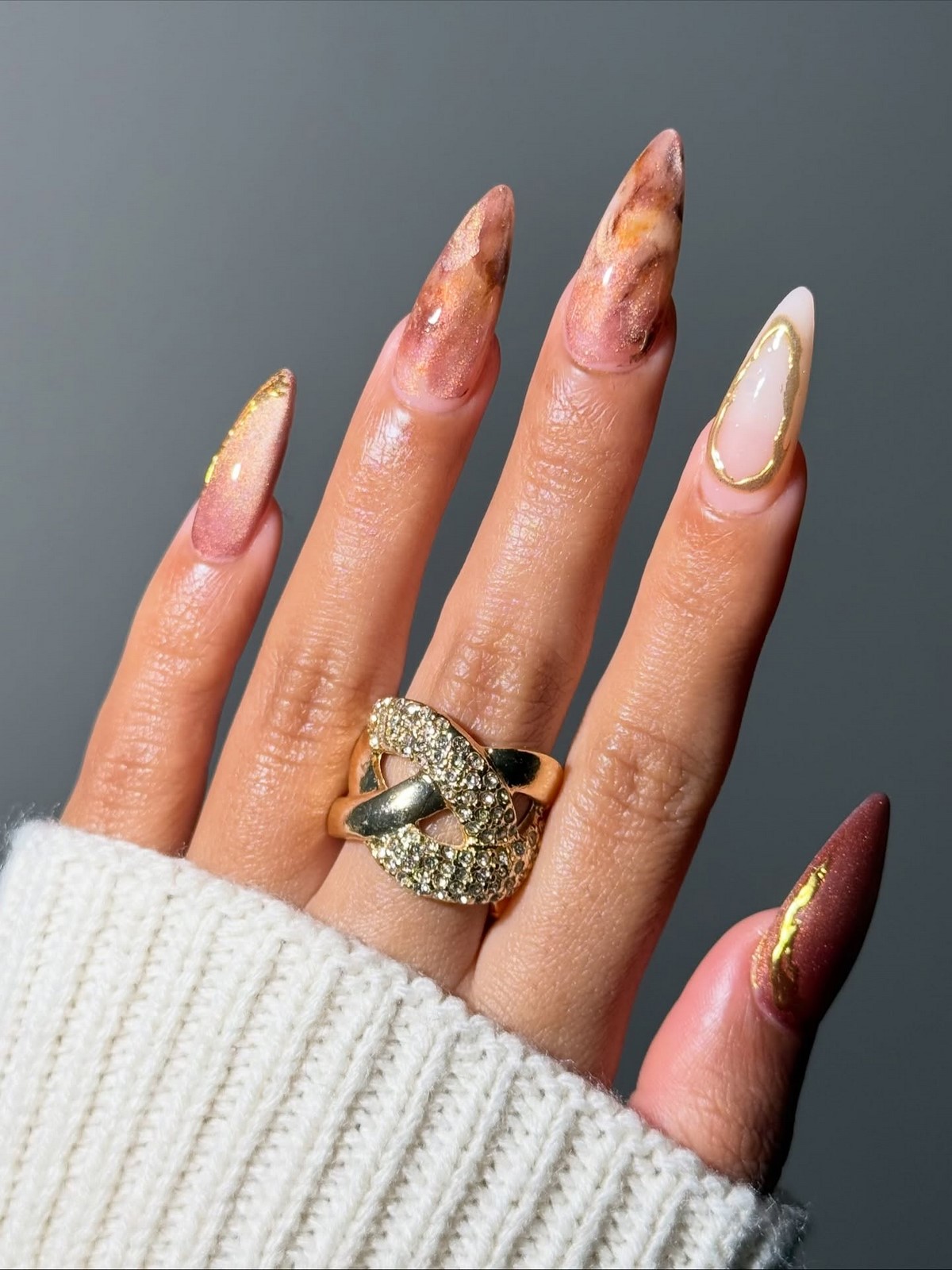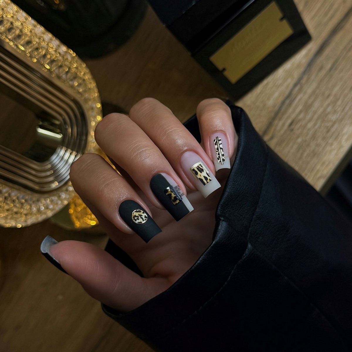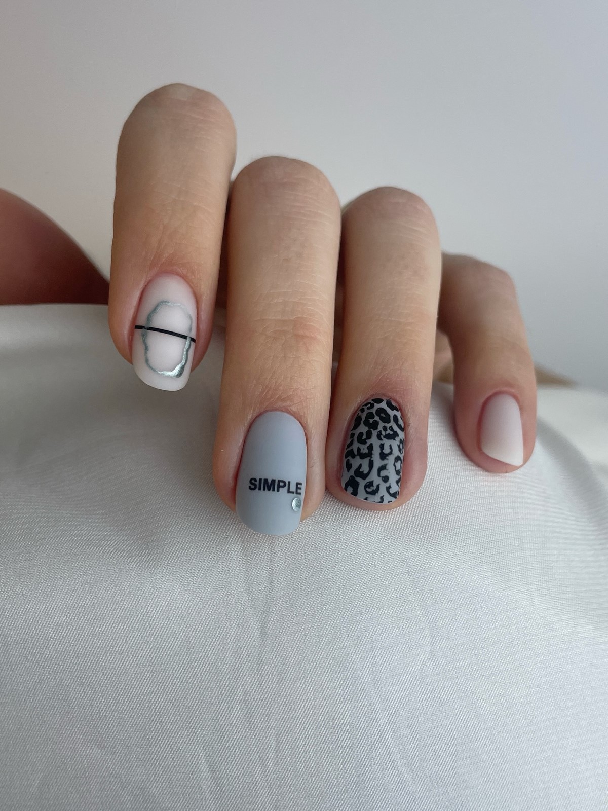 Этот стиль стал главным инструментом для тех, кто любит экспериментировать. В ноябре 2025 Mix&Match — это не хаос, а продуманный баланс разных фактур, рисунков и оттенков. Один ноготь может быть матовым, другой — с градиентом, третий — с декором из фольги или миниатюрным принтом.