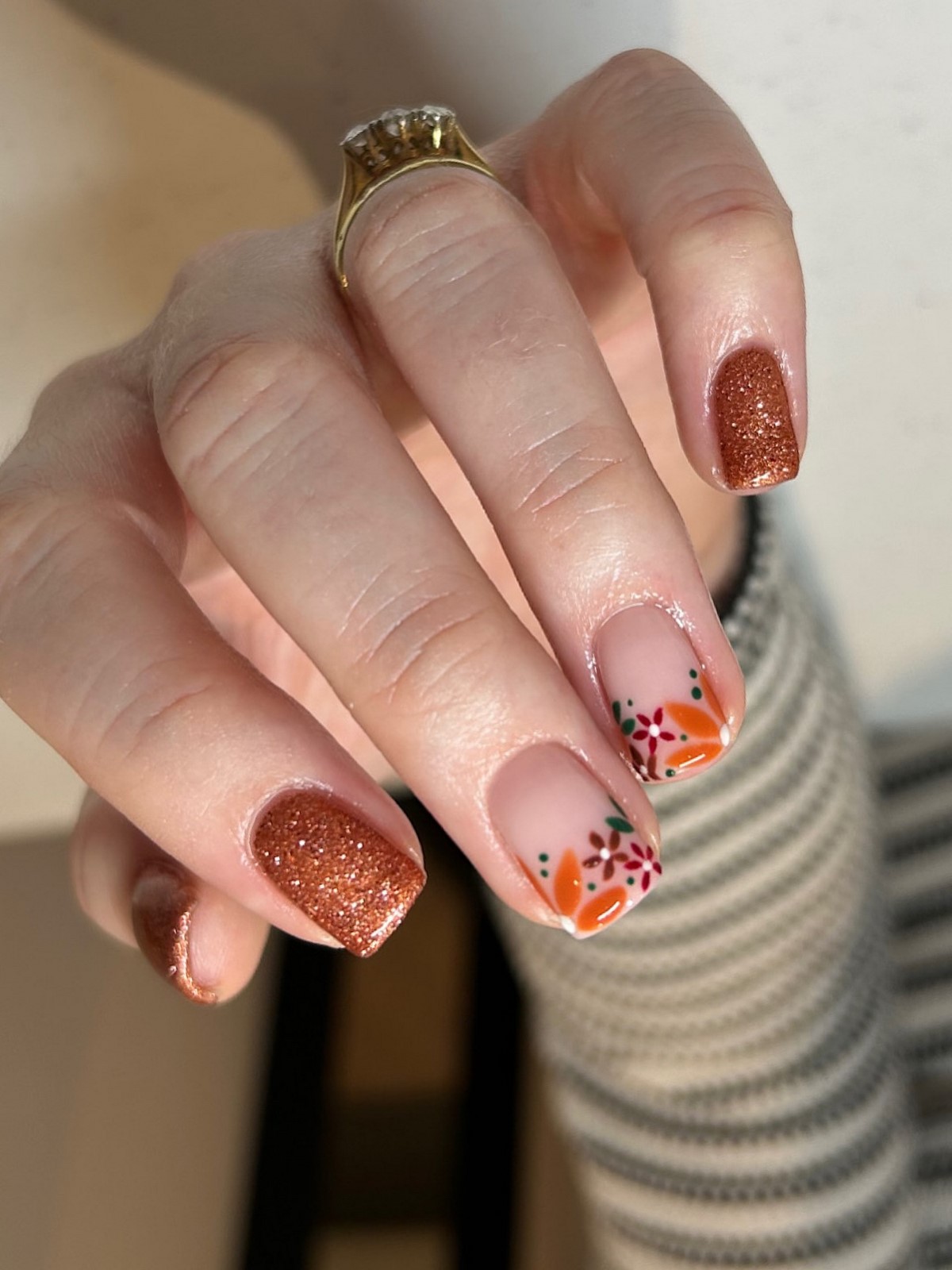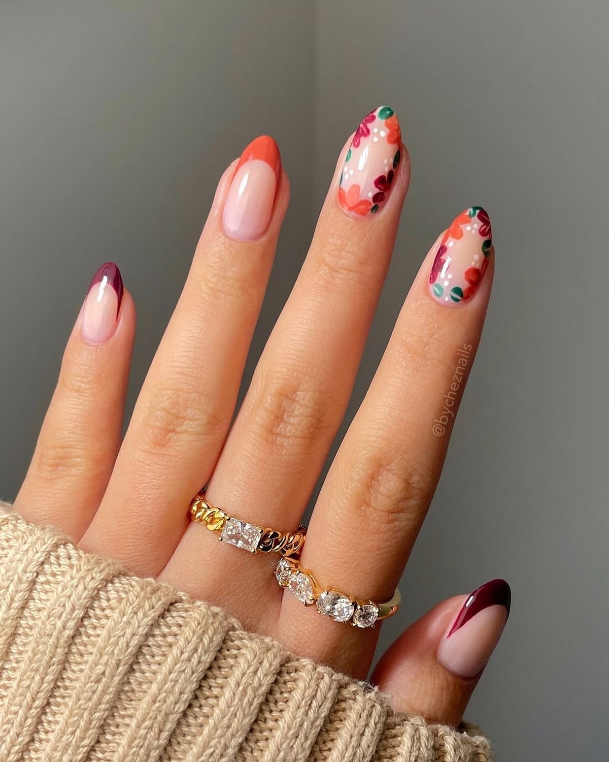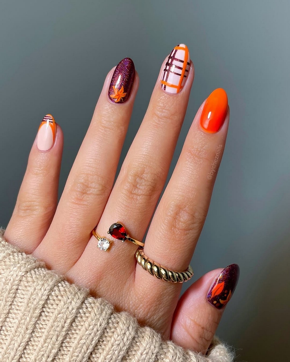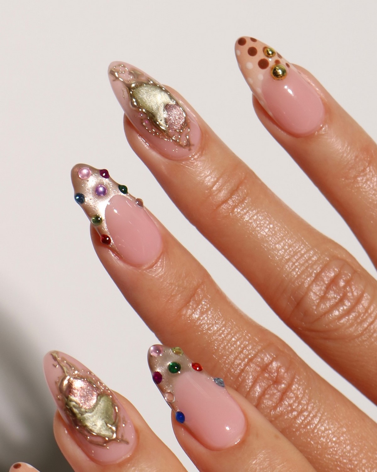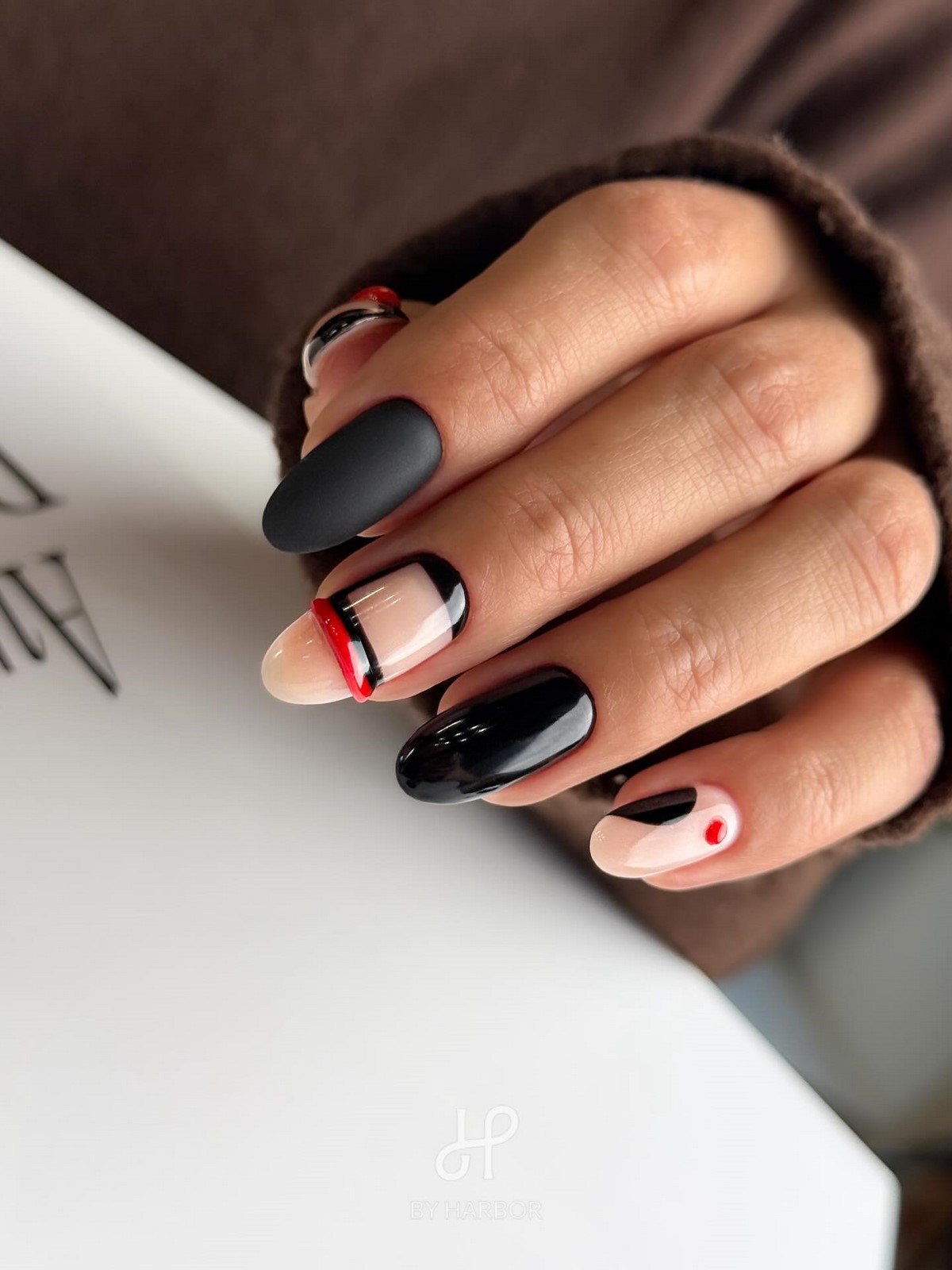 Этот стиль стал главным инструментом для тех, кто любит экспериментировать. В ноябре 2025 Mix&Match — это не хаос, а продуманный баланс разных фактур, рисунков и оттенков. Один ноготь может быть матовым, другой — с градиентом, третий — с декором из фольги или миниатюрным принтом.