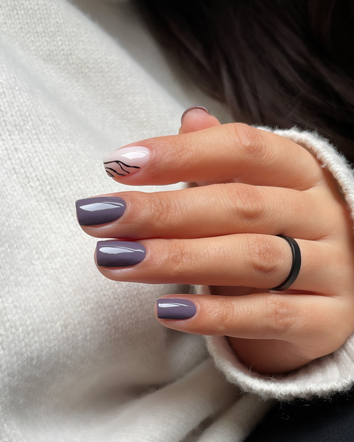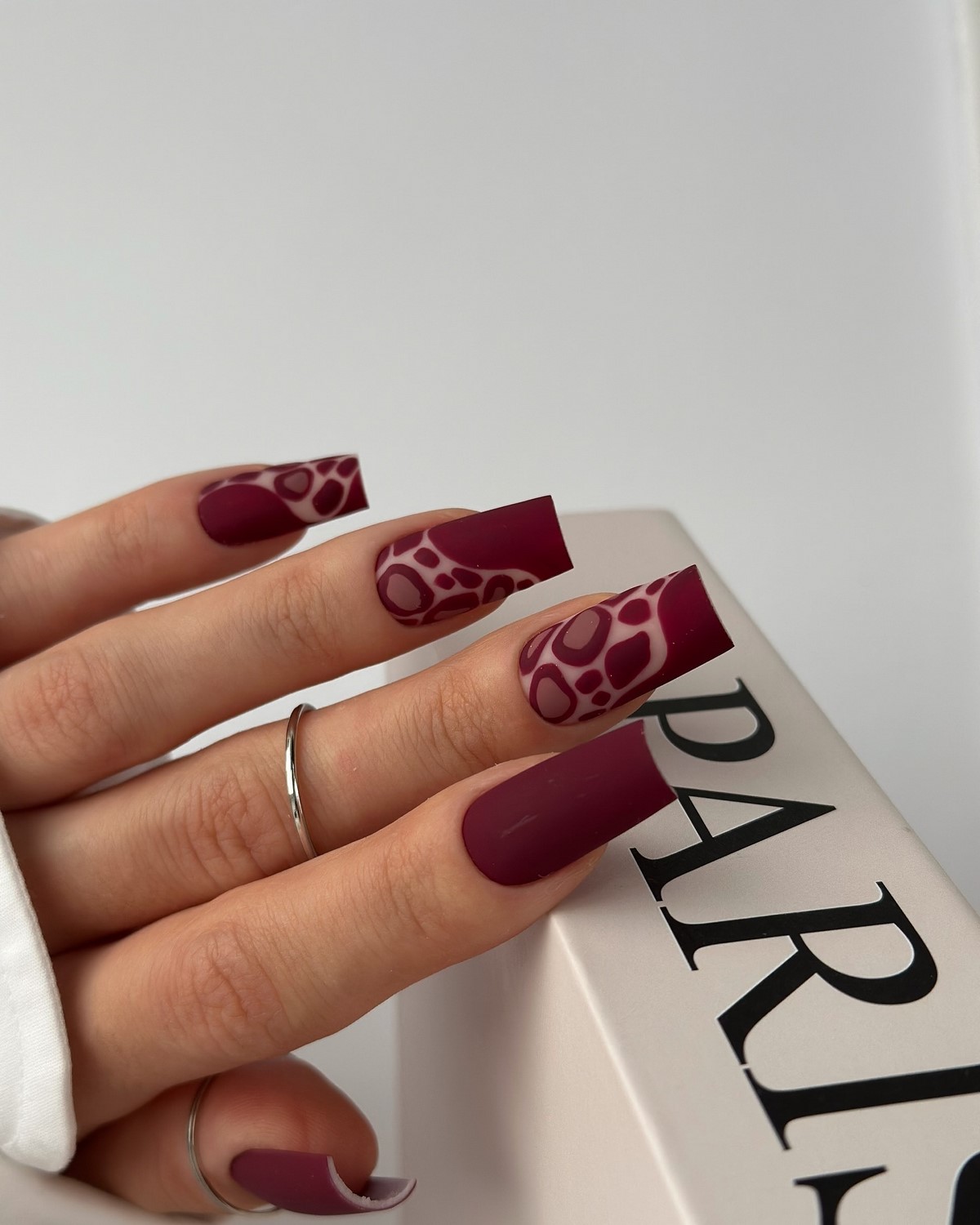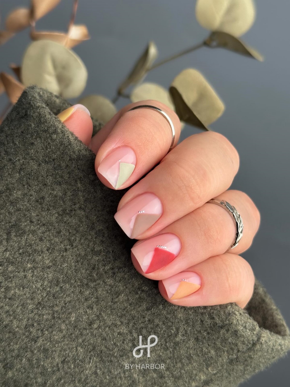 Самые актуальные оттенки для абстрактного дизайна — приглушенный терракотовый, сливовый, хаки, серо-голубой и белый. Такой маникюр идеально дополняет осенние пальто, свитеры и кашемировые пледы, добавляя в образ нотку артистичности.