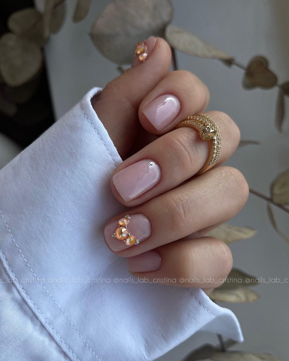 Стразы в ноябре 2025 возвращаются в новом формате — не как кричащий декор, а как точечное сияние. Мастера советуют наносить их аккуратно: вдоль линии кутикулы, на лунку или в центре одного ногтя. Особенно модно — сочетание микростраз с прозрачным или нюдовым покрытием.