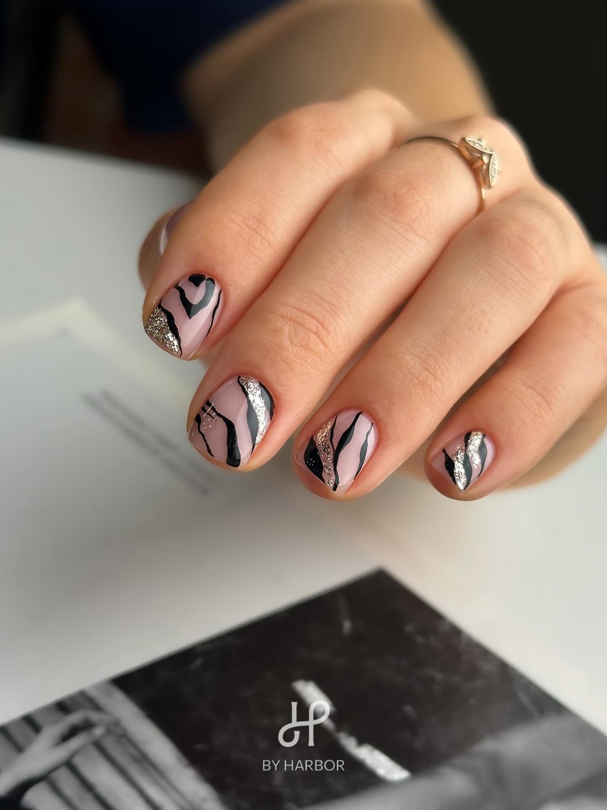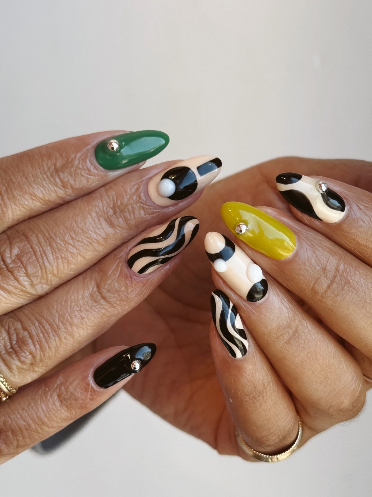 Абстрактный маникюр — тренд, который осенью 2025 года раскрывается с новой стороны. Это не просто хаотичные линии, а игра форм, цветов и текстур. Мастера создают на ногтях целые мини-картины — с переливами, мазками кисти, акварельными пятнами и контрастными акцентами.
