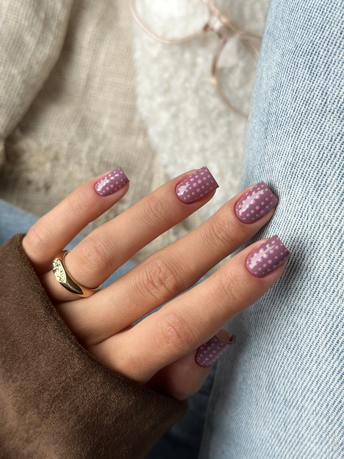 Матовый маникюр осенью 2025 года снова выходит на первый план. Он выглядит благородно, особенно в глубоких бархатных тонах: бордо, шоколад, темно-зеленый или фиолетовый. Мастера предлагают комбинировать матовую и глянцевую фактуру в одном дизайне — например, сделать рисунок лаком по матовой поверхности. Такой контраст добавляет объем и стиль, а ногти смотрятся ухоженно и дорого.