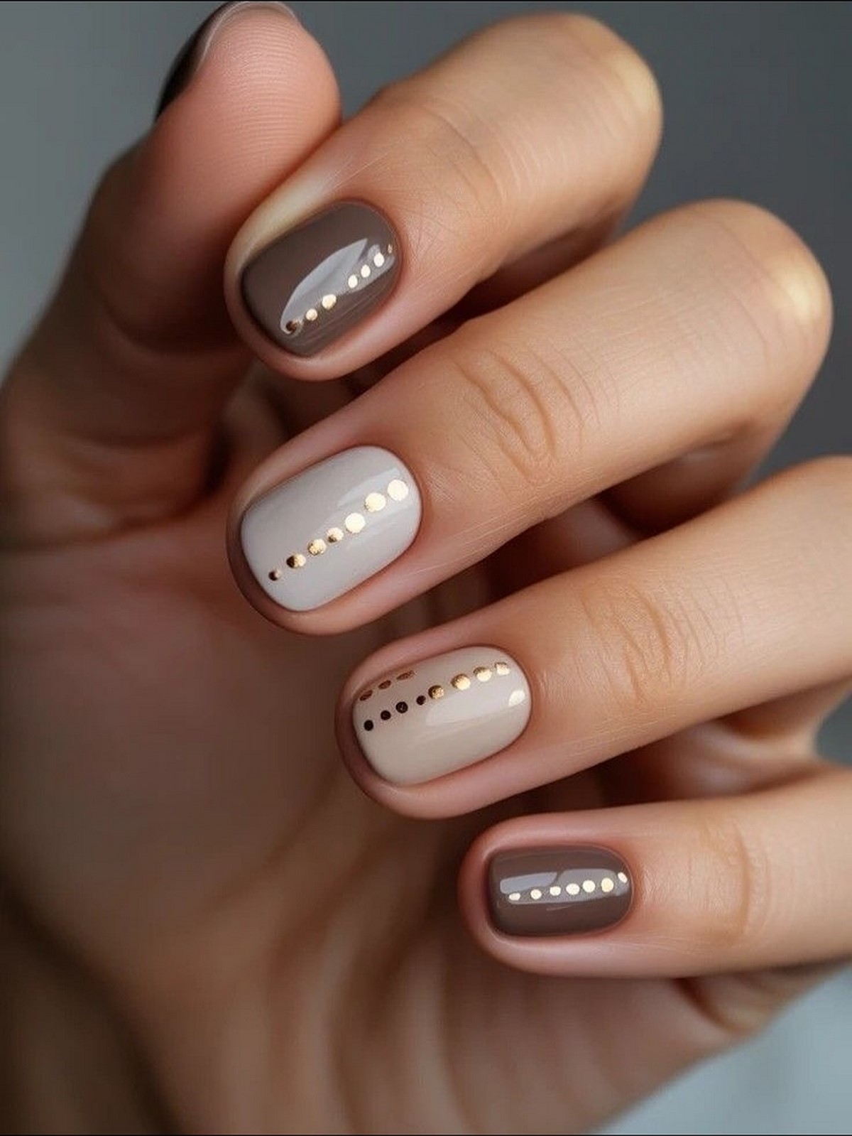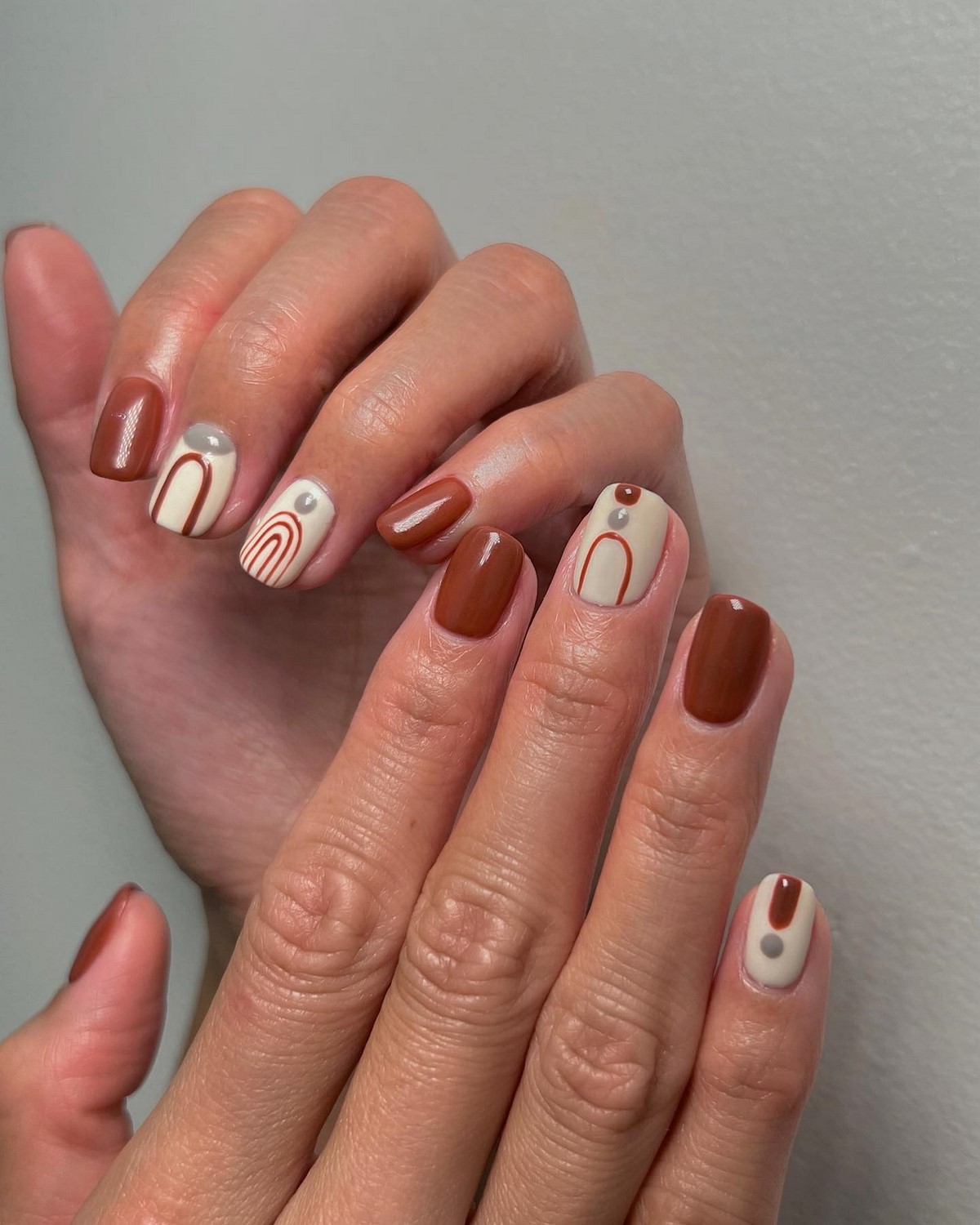 Главный секрет — объединяющая цветовая гамма: все элементы должны быть выдержаны в одной палитре, например, кофейной или сливочной. Такой подход делает маникюр выразительным, но не перегруженным.